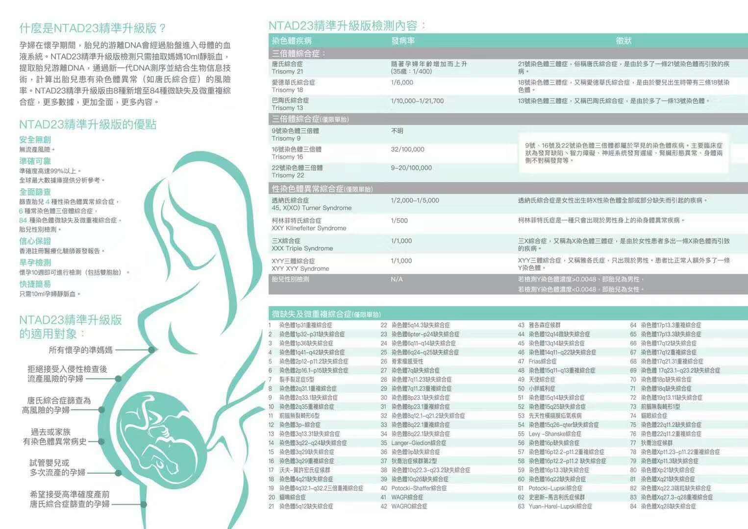 香港无创DNA全新升级版,全面筛查23对染色体,总共检测95项内容,包含Y基因(男女)检测,具体检测内容如下: